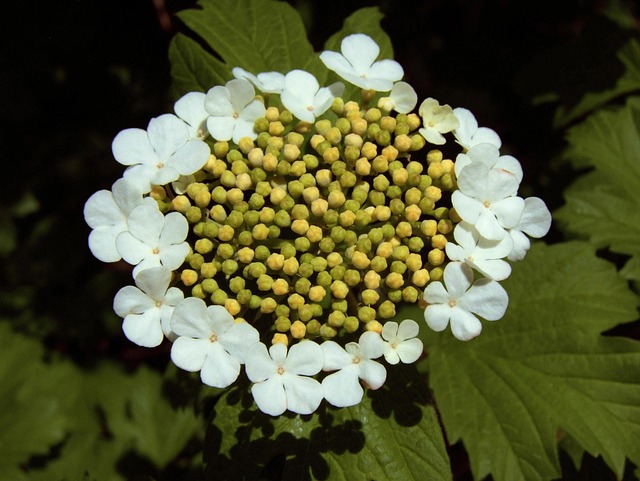 Florile apar la sfârșitul primăverii, în luna mai, și formează inflorescențe rotunde, asemănătoare cu niște bile albe de zăpadă. În unele varietăți, florile sunt sterile, având un aspect plin, dublu, extrem de decorativ. După înflorire, apar fructele – bobițe roșii, translucide, care persistă până iarna și oferă hrană păsărilor.